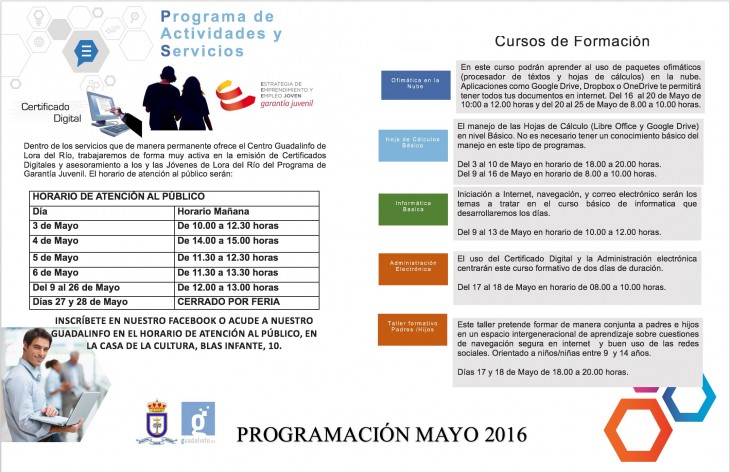 El Ayuntamiento de Lora del Río, a través del Centro Guadalinfo (Concejalía de Administración 2.0), ha presentado la programación de actividades del Centro para el próximo mes de mayo. Se trata de los siguientes cursos y talleres: