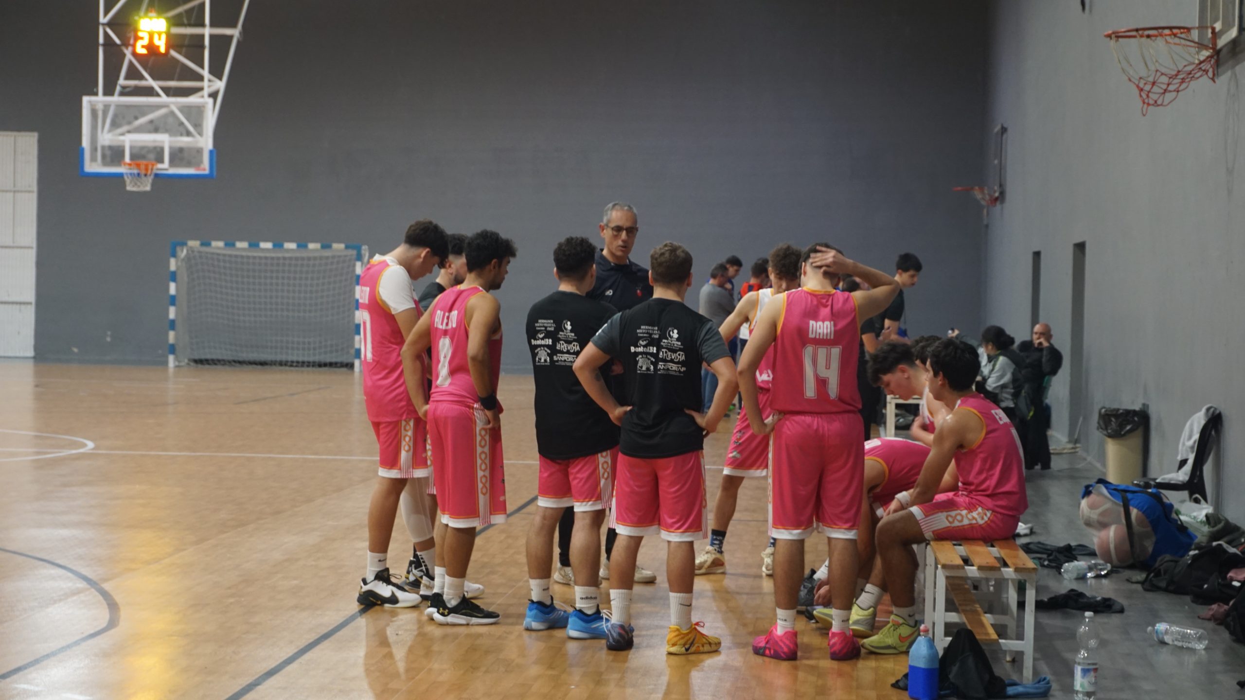 El técnico local José Pedro, se dirige a sus jugadores en unas de las pausad del partido