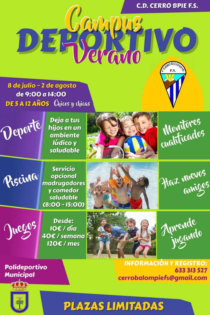 A partir del próximo día 8 de julio hasta el 2 de agosto el Cerro Balompié va a llevar a cabo el primer Campus Deportivo de Verano en Lora del Río. Tendrá por tanto una duración de 4 semanas, de lunes a viernes con un horario base desde las 9 a las 14 horas, con la opción suplemento de 8 a 9 (servicio madrugadores) y de 2 a 3 (servicio comedor saludable), todo ello para niños y niñas de entre 5 y 12 años.