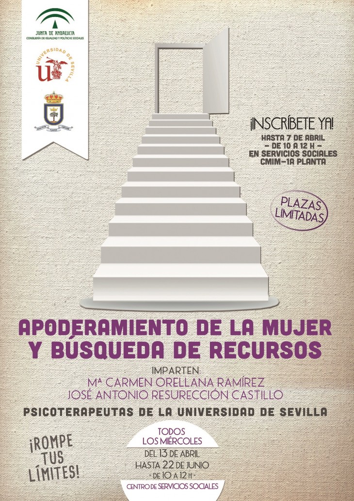 El Ayuntamiento de Lora del Río, a través del Centro Municipal de Información a la Mujer (Concejalía de Bienestar Social e Igualdad), informa que mañana, miércoles 13 de abril, dará comienzo el curso “Apoderamiento de la mujer y búsqueda de recursos”, que será impartido por María del Carmen Orellana Ramírez y José Antonio Resurrección Castillo, psicoterapeutas de la Universidad de Sevilla. El curso se impartirá todos los miércoles desde el 13 de abril al 22 de junio, en horario de 10.00 a 12.00 horas, y en el Centro de Servicios Sociales de Lora del Río.