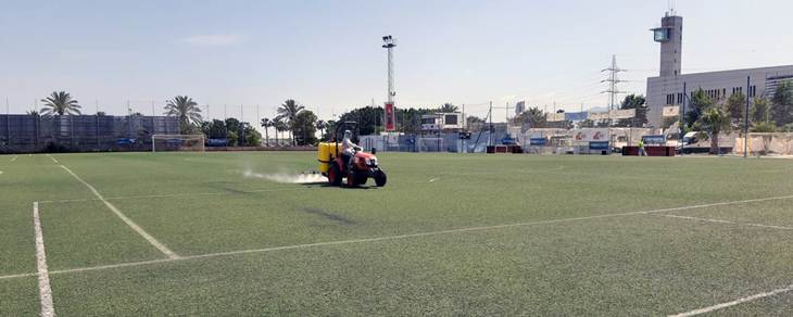 En todo momento, los productos utilizados se encuentran entre los homologados por el propio ministerio para este tipo de desinfección, y se ha establecido una línea de trabajo específica para césped y superficies naturales, y otro para el césped artificial y los terrenos de juego de material sintético.
